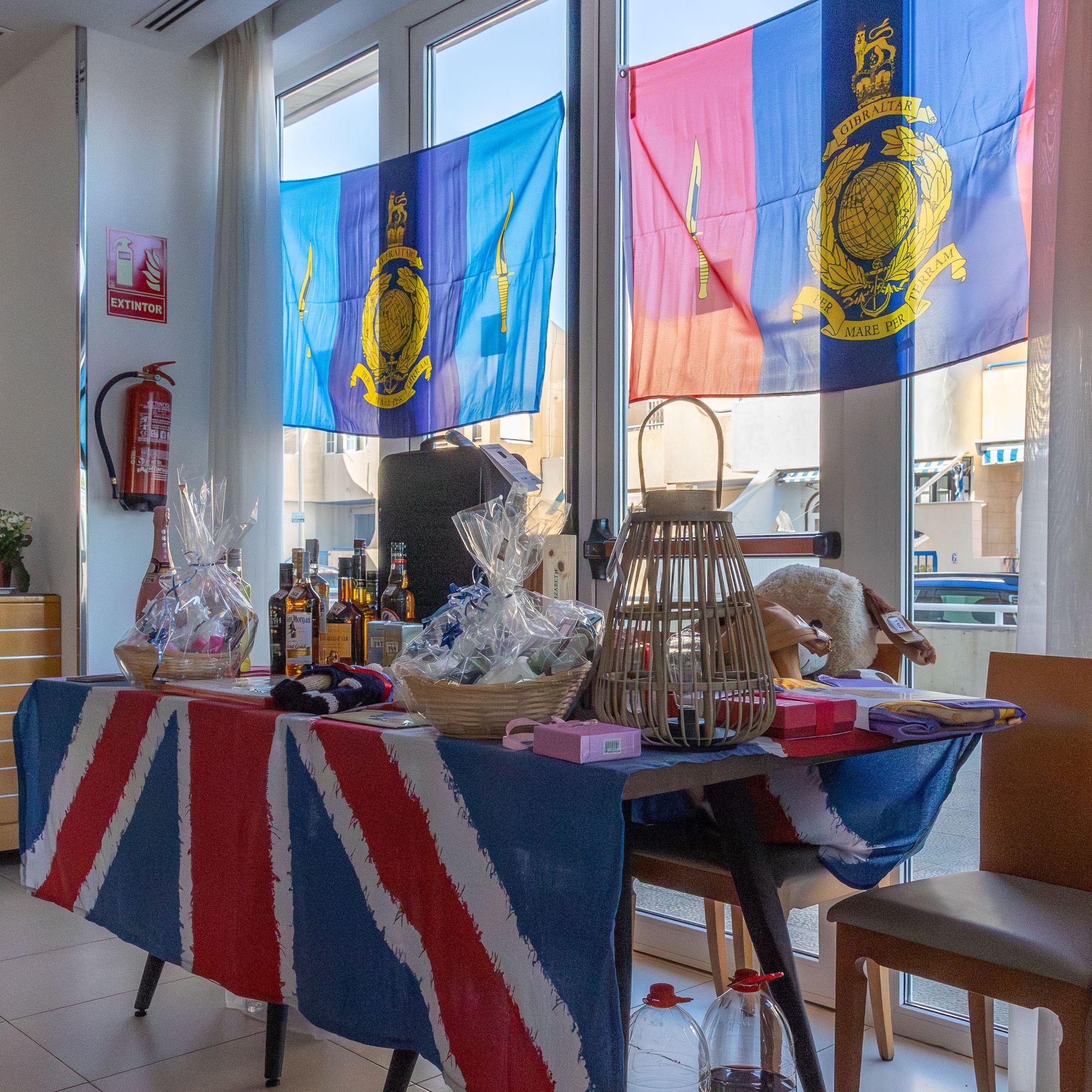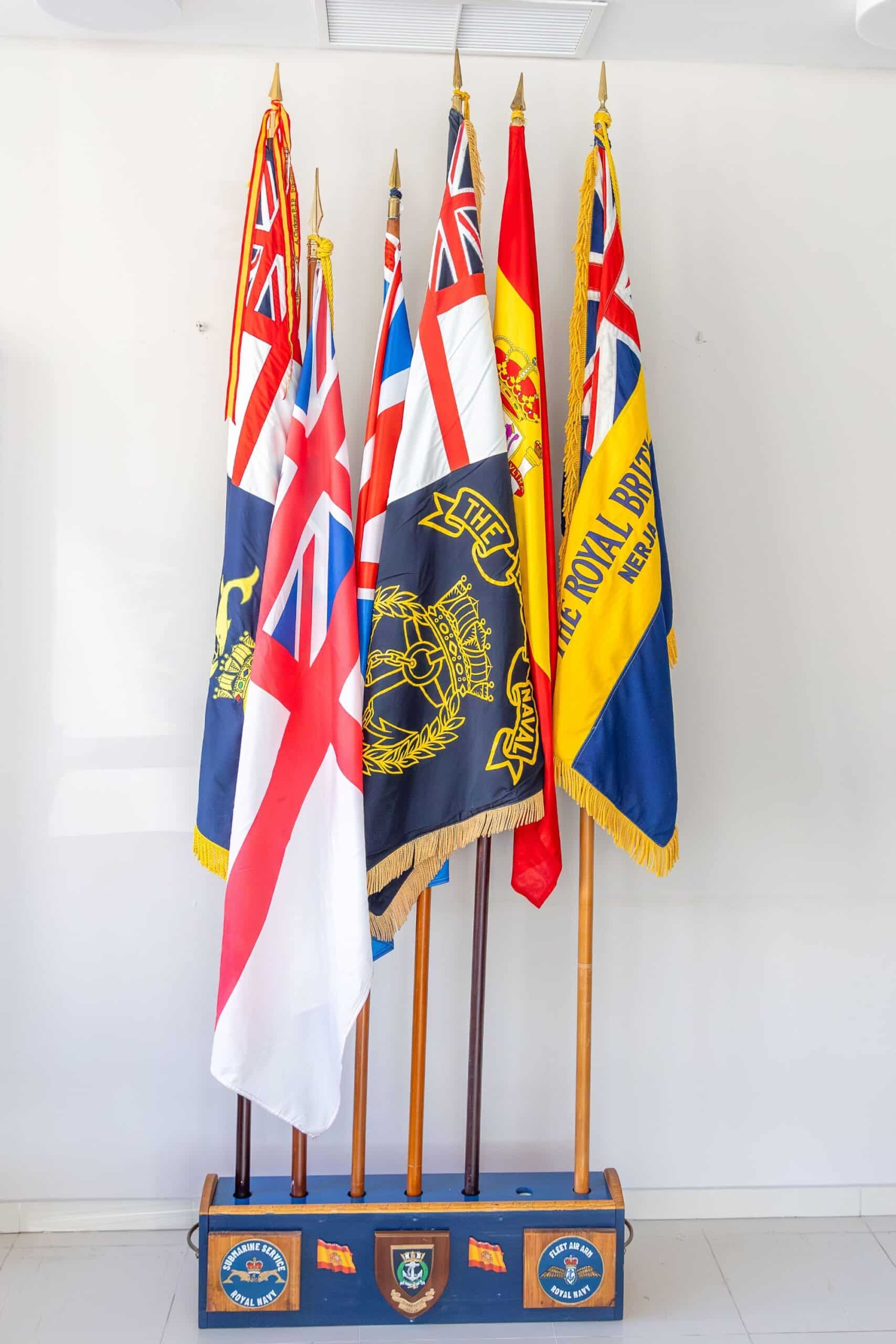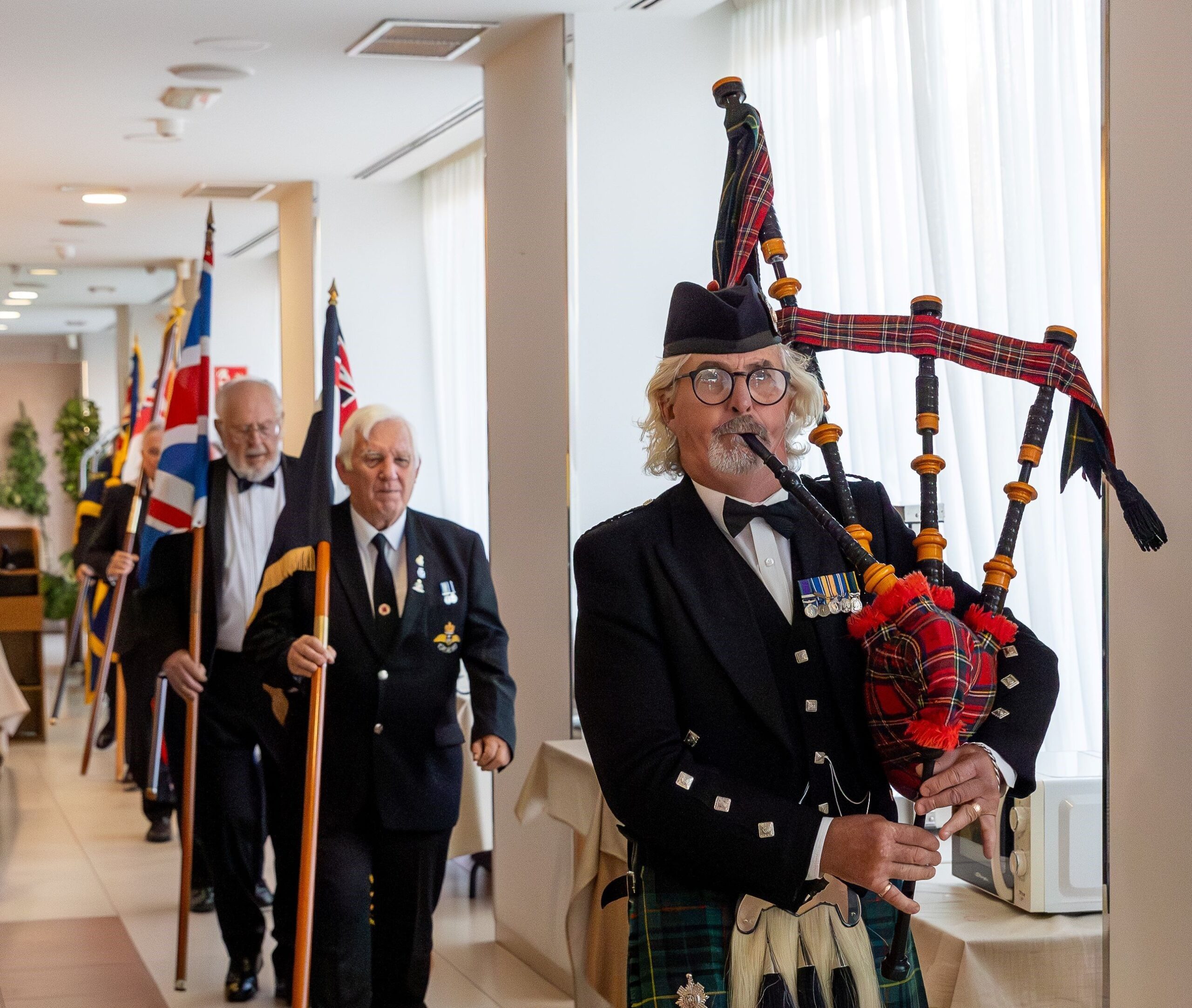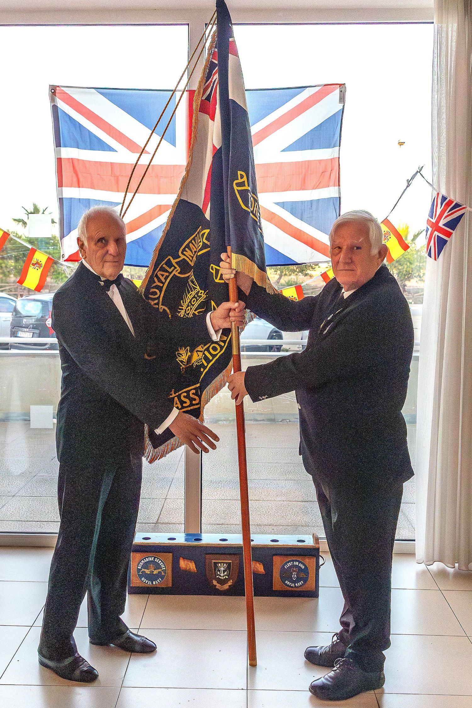 Весь ансамбль проследовал в столовую, где, стоя за своими обеденными столами, наблюдал за изумительным представлением волынщика Гордона Маккензи из оркестра волынок и барабанов Торревьехи, который исполнил мелодию Heart of Oak и прошел под маршем с шестью штандартами, которые несли старший мастер Брайан Далтон (штандарт отделения), старший мастер Сид Эйвери (Юнион Джек), старший мастер Том Паттерсон (испанский флаг), старший мастер Майк Кокман (белый флаг), старший мастер Стив Хемингфилд (Ассоциация подводных лодок Леванте) и приглашенный председатель отделения RBL в Нерхе Эдди Боуи (штандарт отделения RBL в Нерхе). Все штандарты были торжественно приняты старшим мастером Питером Слоггеттом.