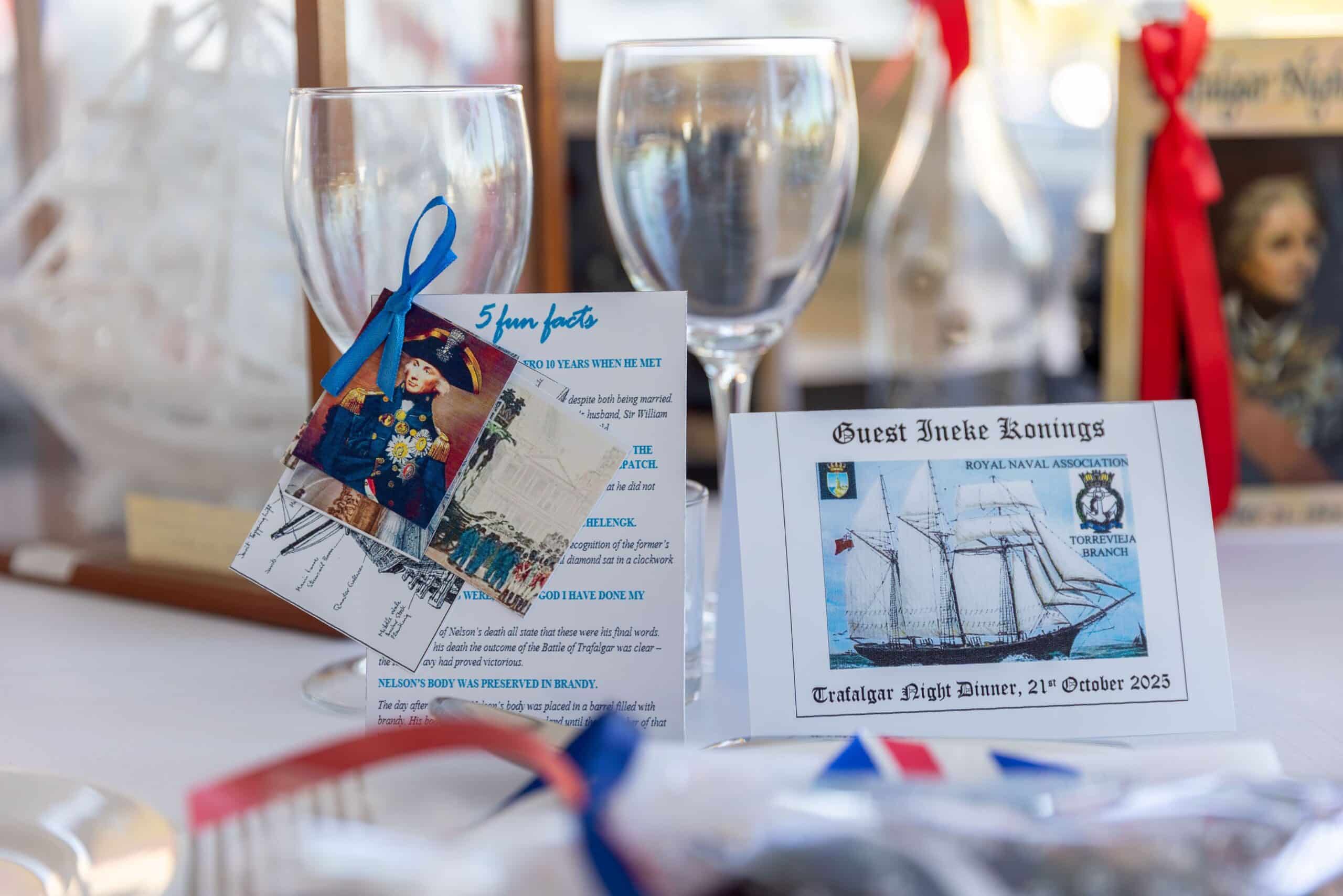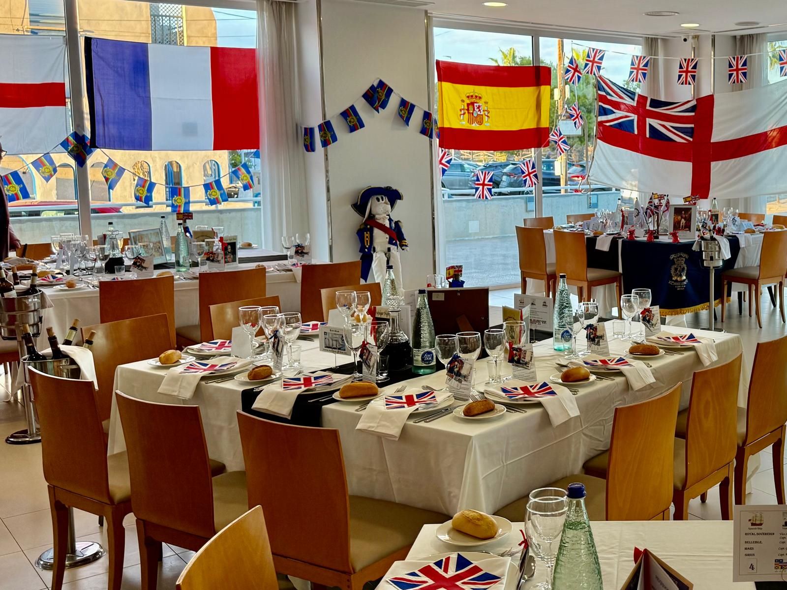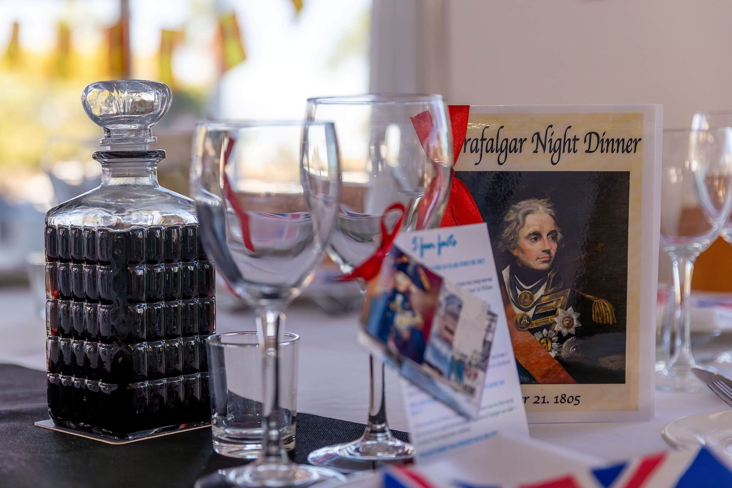 После великолепного обеда из трех блюд и обильного вина последовала традиция «передачи портвейна», во время которой бокалы наполнялись для тоста за «Su Majestad Rey (короля) Филиппа VI Испанского и королеву Летицию Испанскую» (который произносился стоя) и за «Его Величество короля Карла III и королеву Камиллу Соединенного Королевства» (который произносился сидя в традиционном стиле Королевского флота). Затем, перед финальным тостом за «Бессмертную память адмирала лорда виконта Нельсона», публике был предложен познавательный и забавный рассказ капитана ВМС Энтони Крэбба о жизни лорда Горацио Нельсона.